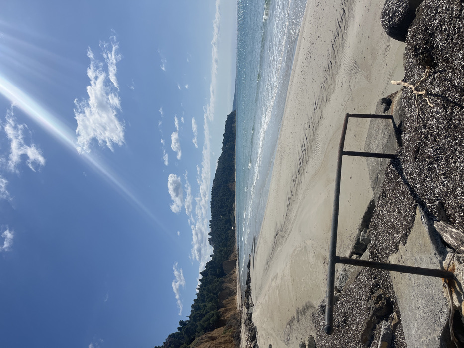 The image presents a wide-angle forensic view of a sandy coastline within the Kassandra Municipal Unit, Greece. The scene is dominated by a bright blue sky with scattered white cumulus clouds, featuring a pronounced sunbeam originating from the upper right. The horizon separates the sky from a light blue-green sea exhibiting gentle waves breaking onto the shore. To the left, a prominent yellowish-brown sandy cliff rises, topped and partially covered by dense green vegetation. The beach itself is composed of light beige sand, stretching into the distance with visible wave patterns on its surface. In the immediate foreground, a dark, rusty metal handrail, consisting of a horizontal bar supported by two vertical posts, is positioned above a damaged concrete or stone surface. This surface and the surrounding ground are heavily covered with a thick layer of dark brown organic debris, primarily dried seaweed and small wood fragments. A distinct, gnarled light-colored piece of driftwood rests within this debris in the lower right foreground. No individuals, animals, or active human interactions are depicted within the frame.