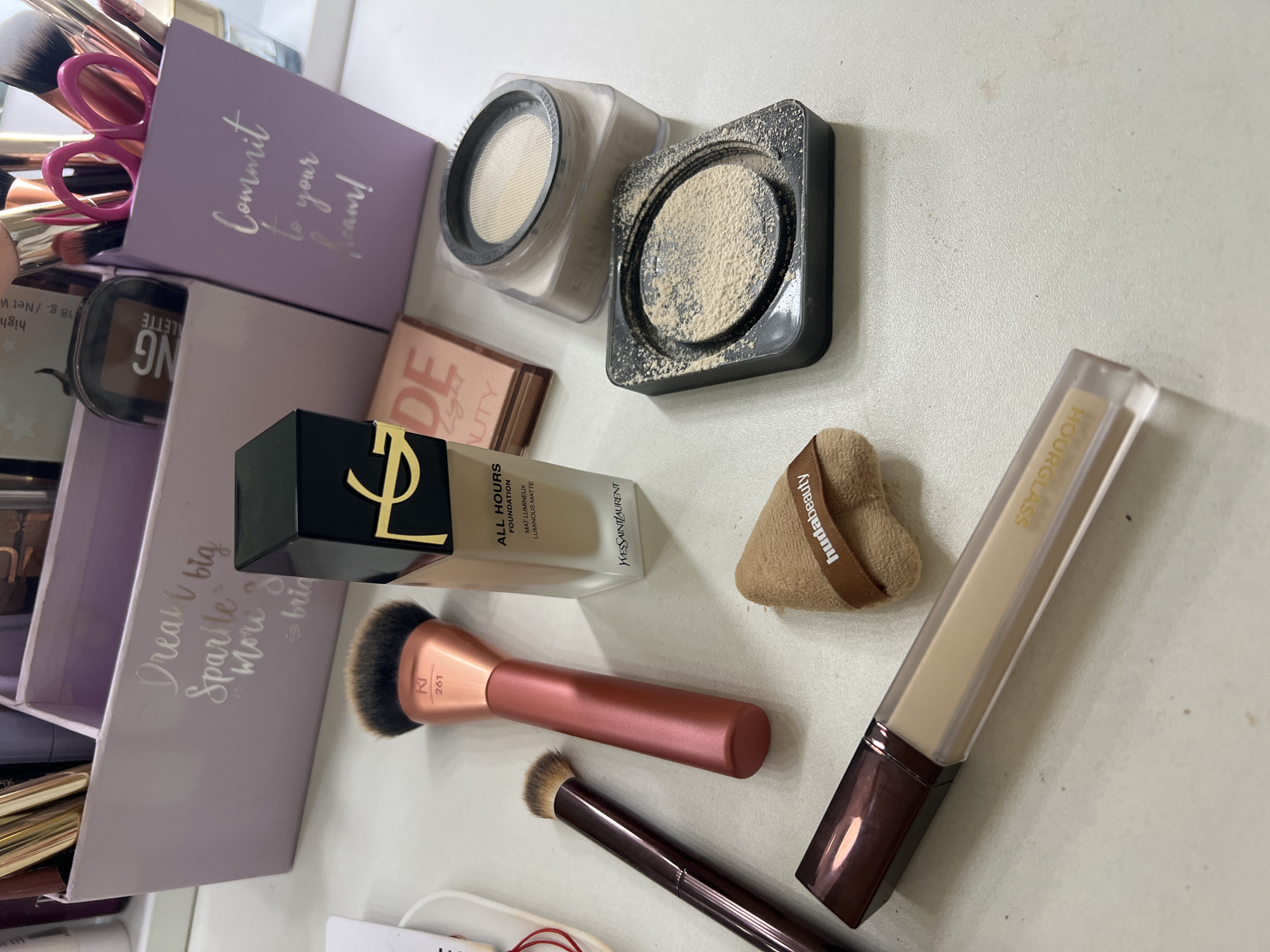 collection of makeup products on a light-colored surface, possibly a table or vanity. Visible items include a YSL All Hours Foundation bottle, Hourglass concealer, Huda Beauty powder puff, two loose powder containers (one square and one round), a Nude Light palette, a dark powder palette with the letters "NG", various makeup brushes, and three lavender storage containers. The brush on the table is labeled "RT 261." The containers have inspirational phrases written on them: "Commit to your dream!" and "Dream big, sparkle more, shine bright." The scene is close-up and lacks contextual clues about a specific location. There is no evidence to suggest the image was taken in Markovo, Bulgaria. There are no people visible in the scene.