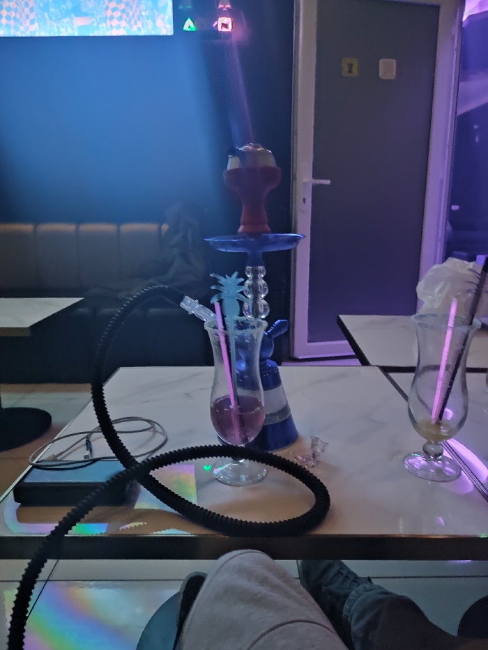 A hookah dominates the center of the scene, with a long black hose snaking across a white marble table. Two cocktail glasses, each with a straw, sit on the table. One is filled with a reddish liquid, while the other appears to be empty. A smartphone rests near the hookah hose. In the background, a padded bench is visible along with a gray door with a rectangular window. The image is lit with a mix of blue and purple hues.