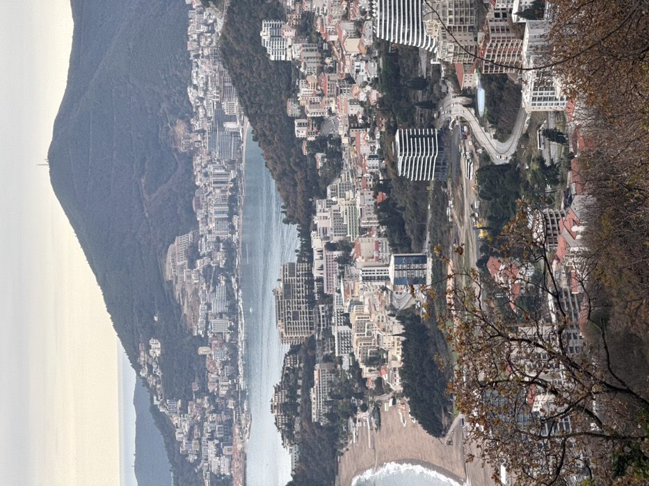 The image displays an expansive, elevated panoramic view of a densely developed coastal city and bay, identified as being located in Podbadac, Montenegro. The scene is observed under an overcast, light grey sky. In the immediate foreground, out-of-focus branches from deciduous trees with sparse brown and orange leaves partially obscure the lower portion of the frame. Below and beyond this foliage, elements of the city become distinct. The midground features a prominent crescent-shaped sandy beach on the left, meeting a body of blue-grey water. A road or promenade runs parallel to the beach, lined with multi-story buildings. The urban landscape consists of numerous residential and commercial structures, varying in architectural style from traditional white buildings with red roofs to modern complexes featuring glass facades and distinctive curvilinear or horizontally-striped designs. A significant, tiered white building is visible near the beach on the left, and a multi-story building with a blue-tinted glass facade stands prominently in the central-left midground. A winding road with visible vehicles traverses the midground, with a notable curved section. Green vegetation, including trees and shrubs, is interspersed throughout the urban areas and on the lower slopes. In the background, a large bay extends across the frame, populated by several small boats or yachts. Across the bay, additional city development sprawls up the slopes of a forested mountain range. This distant urban section also exhibits a mix of multi-story buildings and visible signs of construction activity on the higher terrain. The horizon shows a vast expanse of water meeting the sky on the far left. The backdrop is dominated by two large, forested mountains; the more prominent one in the center-right is topped with a distinct communication tower or antenna. No specific individuals or discernible actions are visible due to the high vantage point and distance.