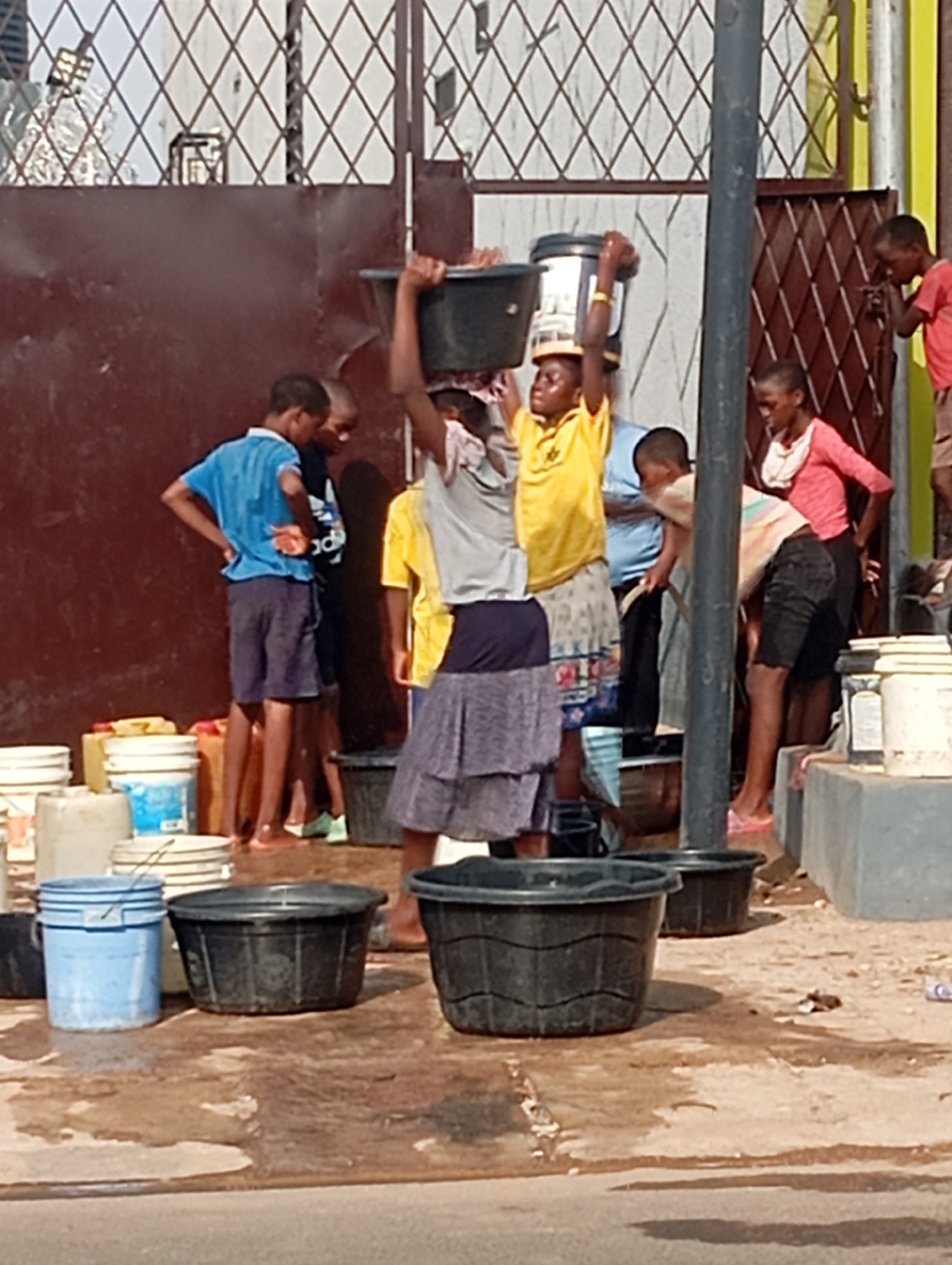 In Makurdi, Nigeria, several individuals, predominantly children, gather around a water source. Two people are carrying buckets on their heads. There are several buckets in the scene, both empty and full, scattered on the ground. There is a large metal gate in the background, and the area appears to be a street or public area. A utility pole is in the frame.