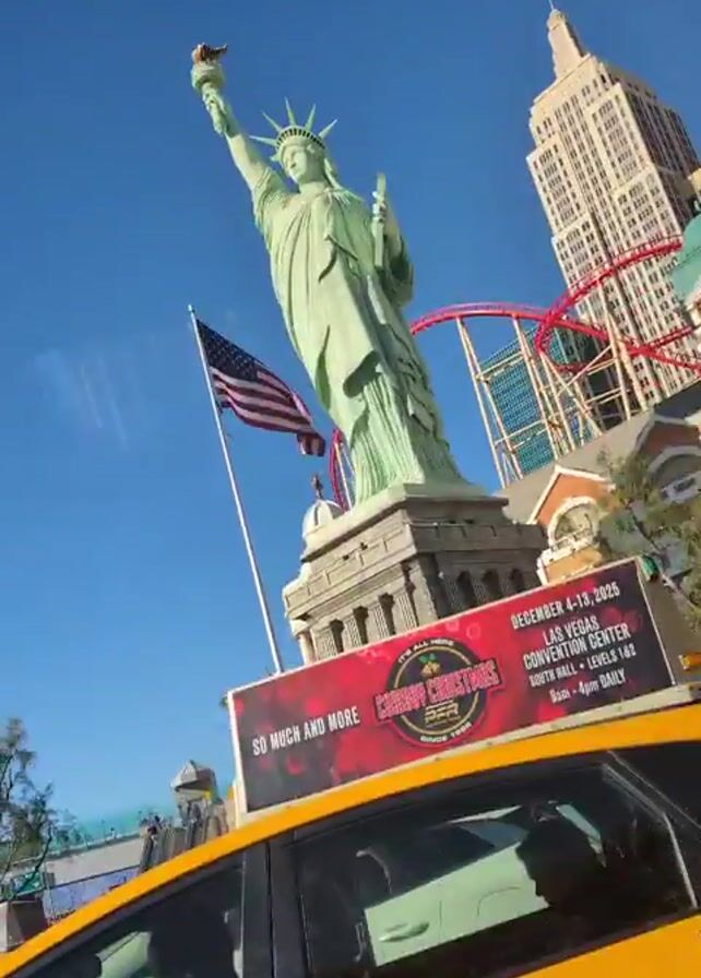 view from a yellow taxi driving past Las Vegas landmarks. The Statue of Liberty replica is visible, along with the New York-New York Hotel & Casino with its red rollercoaster. An American flag is waving. The video then pans to show the Excalibur Hotel with its castle-like architecture. The sky is clear and blue. The vehicles are stopped in traffic. A sign for "Country Christmas" is visible.