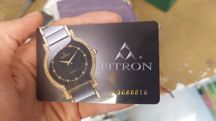 A person's hand grips a vertically oriented black plastic card, centrally positioned within the frame. The card displays a prominent image of a gold-toned FITTRON brand quartz wristwatch, featuring a black dial, gold hands, and a bezel extensively encrusted with small diamonds or crystals. Additional crystals mark the hours on the dial. The watch's band appears to be a combination of gold-toned and black segments. Vertically printed in white/silver lettering on the lower half of the card is "FITTRON," accompanied by a distinct angular logo below it. Along the left edge of the card, the gold serial number "01688816" is vertically printed. The background, out of focus, reveals a light brown or tan surface, consistent with a tabletop, scattered with fine white particulate matter. A blurred purple object is partially visible to the right, and indistinct green and white elements are present in the bottom left. The image does not contain any discernable visual information to determine a specific geographical location, including Barza Municipality, Syria.