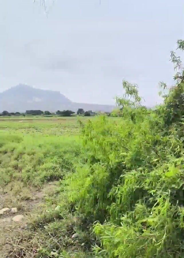 rural landscape. The opening shot features a tree with a dense growth of green plants around it. The camera then pans to reveal a field of green grass with a mountain in the background under a cloudy sky. The camera continues to pan across a dirt road with some vegetation on the sides. The road becomes more rugged with dirt and large rocks. There is some visible trash. The video ends with a wider view of the dirt road, rocks, and surrounding vegetation. The sky lightens slightly towards the end. The sound of a motor can be heard in the background throughout the video.