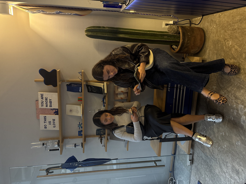 Two young adult females are seated inside a modern establishment in San Andrés Cholula, Mexico