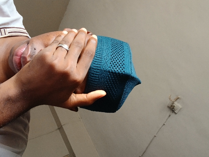An individual, partially visible, is depicted indoors within a room in the city of Lagos, Nigeria. The subject, a dark-complexioned person, is wearing a teal-colored, woven skullcap and a white garment with a striped neckline detail. The person's right hand, adorned with a silver-colored ring on the ring finger, is placed over the upper face, obscuring the eyes and nose. The lower lip and chin are visible. Overhead, a light-colored ceiling shows an exposed, rectangular electrical box with a thin white wire extending diagonally downwards. Strong natural light illuminates the scene from the left, creating defined highlights and shadows.