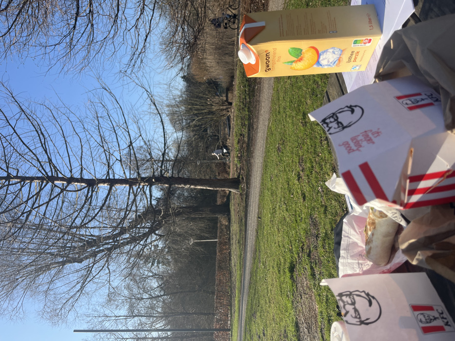 The image displays an outdoor scene within a park in Eindhoven, Netherlands, illuminated by clear daylight under a bright blue sky. In the foreground, a wooden surface, likely a picnic table or bench, holds a collection of items. These include two white KFC fast food boxes, partially open, with the brand's logo and "it's finger lickin' good" text visible on one. A wrapped food item, resembling a burrito, is positioned in white paper within a brown paper bag. Standing upright is a 1.5-liter carton of "G'woon Lijsthee Perzik" (Peach Iced Tea), displaying images of a peach and ice cubes. The midground features a curving, unpaved path traversing a green grassy area. A dense, short brown hedge borders a section of the path. Several tall, bare deciduous trees with visible branches and trunks are scattered throughout the park landscape. Two park lamps with single light sources are also discernible. Two individuals are present on the path, both cycling. One individual, wearing a light-colored top, cycles away from the camera towards the left side of the path. A second individual on a bicycle is partially visible on the right side of the path, largely obscured by the iced tea carton. The background consists of further bare trees and dense, distant vegetation.