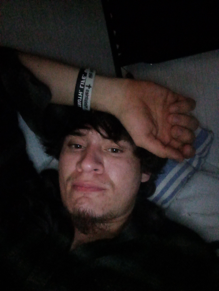 A man with dark hair and a goatee is lying down. His right arm is bent with his hand near his head, wearing a white wristband. He has a neutral expression. The lighting is dim. The background consists of what appears to be bedding, with a striped pillow visible. A dark object is in the background at the top of the picture.