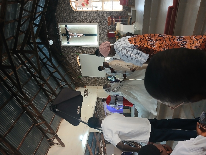 The image depicts an indoor wedding ceremony or photoshoot occurring within a church, located in the City of Unknown, Unknown. The central figures are a bride and groom positioned slightly left of center. The bride wears an elaborate white long-sleeved gown with a full skirt and a veil. The groom stands to her right, dressed in a light-colored suit. Behind them, an individual in red and white clerical vestments is partially visible, facing the couple. To the far left, a person in a white short-sleeved shirt and dark trousers stands beside a black 'Godox' branded softbox on a stand, which is angled towards the main subjects. The background features a large crucifix mounted on the rear wall, illuminated within a recessed, light-colored frame. To the left of the crucifix, a white rectangular projection screen is visible. The church interior includes walls with a textured stone-like finish and a corrugated metal roof with visible wooden trusses. A white altar adorned with flowers is visible on the right side of the frame, with several red chairs positioned further right. A woman in a patterned traditional dress and head wrap is visible on the right, facing the couple. Other individuals are partially visible in the foreground and background, observing the scene.
