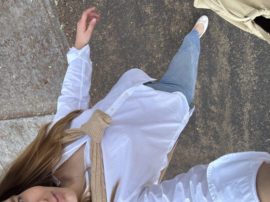 Overhead shot of a woman wearing light-wash denim jeans, a white button-down shirt, and white ballet flats. A tan cable-knit sweater is draped over her shoulders, partially obscuring the shirt. Part of a light beige handbag is visible in the top right corner. The background appears to be a concrete or paved surface. The woman is facing the camera, partially visible in the lower left.