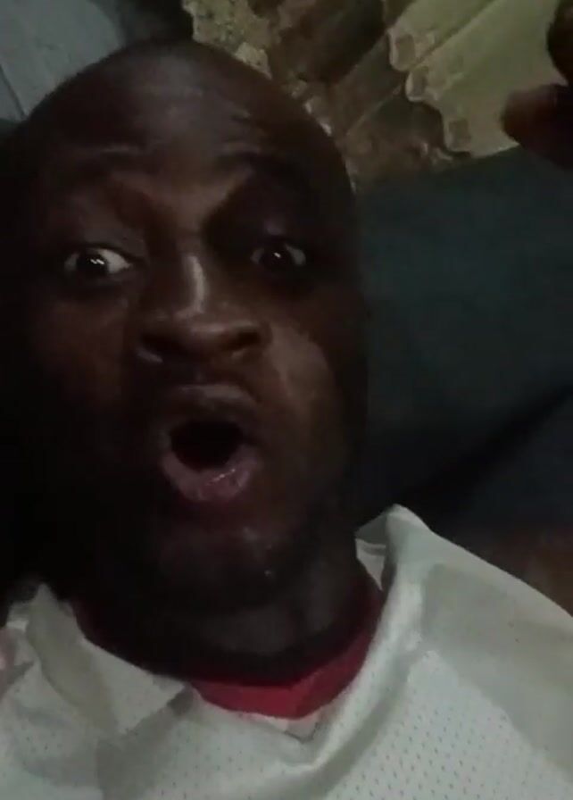 A man with dark skin and a shaved head wearing a white shirt with a red neckline is visible from the chest up. He has a small amount of facial hair. He is lying down, looking up at the camera with exaggerated expressions on his face. He first opens his mouth wide, then makes his lips into an O-shape, then rolls his eyes upward, and finally, he smiles. The background is blurry, but it appears to be a wall or ceiling of some kind.