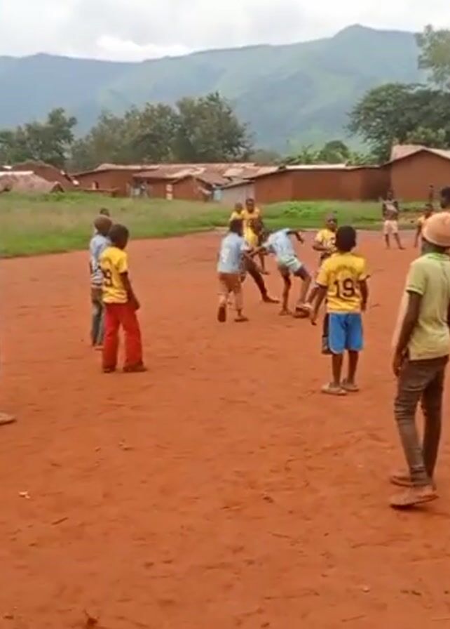 A group of children are playing soccer on a dirt field. The field is surrounded by simple buildings and trees. In the background, there are mountains. Most of the children are barefoot, and they are wearing various shirts and shorts. Some of the children are wearing jerseys with the number 19 on them. The ball is in the middle of the field, and the children are running and kicking at it. The weather appears overcast.