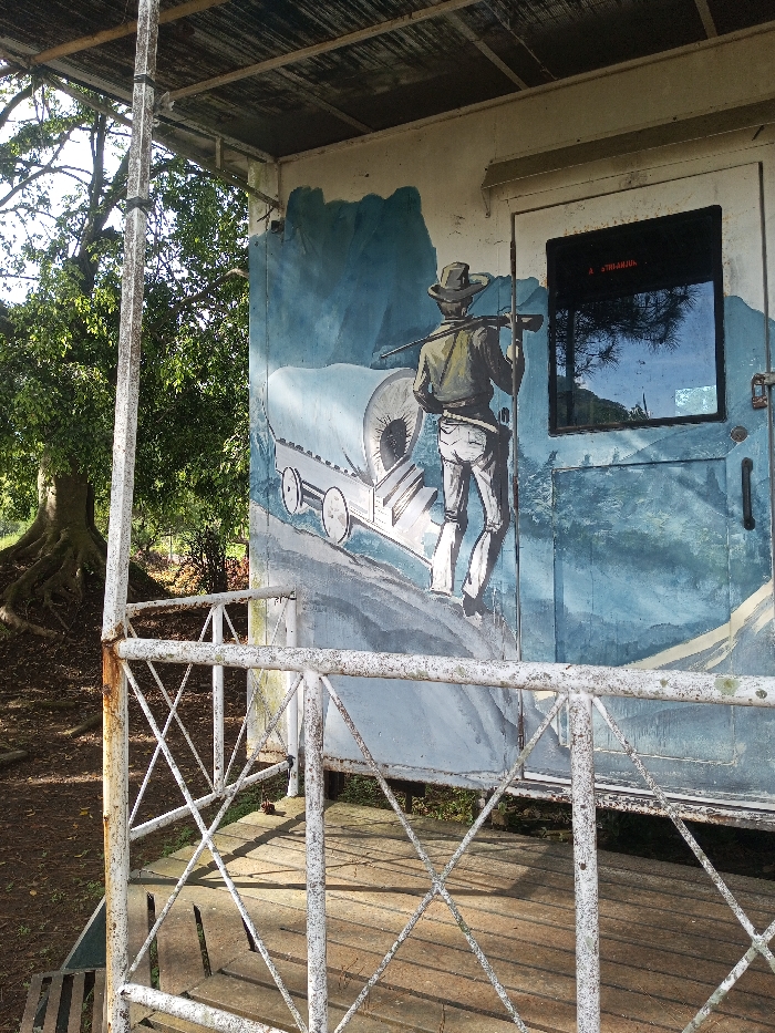 A mural on the side of a building depicts a cowboy leading a covered wagon up a hill. The cowboy wears a hat and carries a rifle over his shoulder. The scene is painted in shades of blue, gray, and white. A window is set into the side of the building next to the mural, reflecting the sky and trees. A weathered white metal railing in the foreground partially obscures the view. A tree is to the left of the structure.