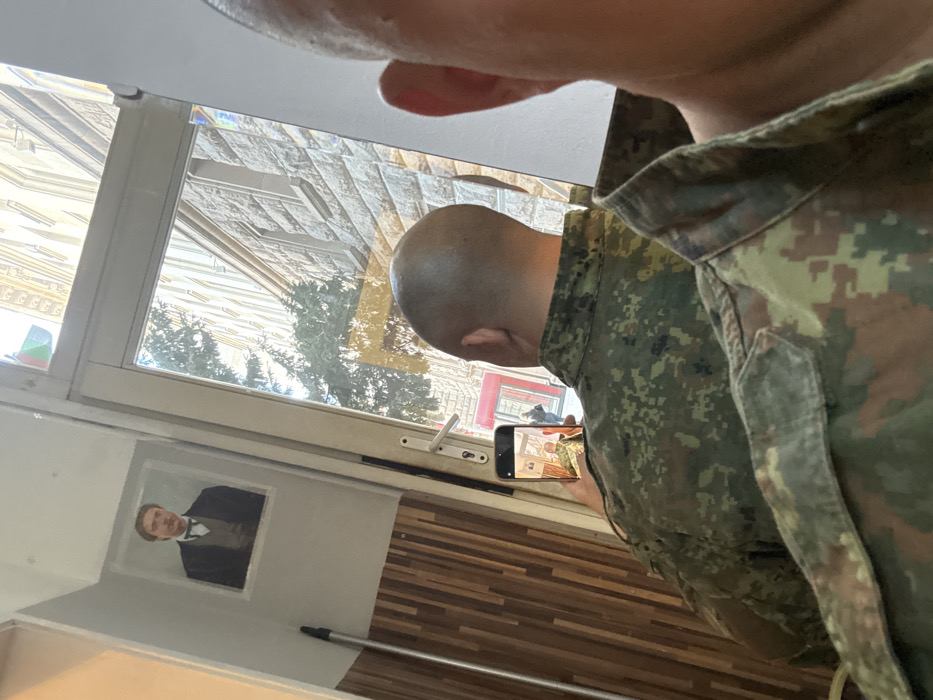 The image captures an indoor scene looking out through a glass door or window onto an urban street in Sofia, Bulgaria. In the midground, a person with a shaved head is seen from behind, wearing a pixelated green, brown, and tan digital camouflage uniform. This individual holds a silver-colored smartphone vertically in their right hand, with its screen displaying a partial image of their own camouflage uniform. In the immediate foreground on the right, the top of a second person's shaved head and the collar of a similar camouflage uniform are visible, indicating the perspective is from closely behind and to the right of the person holding the phone. To the left of the glass door/window, a framed portrait painting hangs on a white wall. The portrait depicts a man with light brown hair and a mustache, dressed in a dark suit, light vest, and bow tie, consistent with 19th-century attire. This figure is commonly recognized as Hristo Botev, a Bulgarian national hero, often displayed in establishments across Bulgaria. Below the portrait, a silver-colored broom handle leans against a wall section paneled with horizontal wooden slats in varying brown hues. Through the glass door/window, a bright urban exterior is visible. A multi-story building with a light-colored, possibly stone or stucco, facade featuring distinct rectangular windows lines the street. Green foliage from a tree is present in the foreground of the outdoor view. Further down the street, a red awning or signage is discernible, along with blurry figures of pedestrians. The architectural style and the prominent portrait identify the location as within the city of Sofia, Bulgaria.