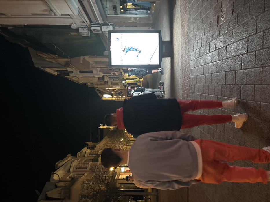 The image captures a nighttime scene on a pedestrian street in Plovdiv, Bulgaria. Two males are depicted from behind in the foreground, walking away from the camera. The male on the left wears a light grey crewneck sweatshirt and red-orange sweatpants. The male on the right wears a black jacket with a red hood visible at the neck and red sweatpants, complemented by white athletic shoes. The street is paved with rectangular grey and reddish pavers. Buildings with multi-story facades, some featuring balconies, line both sides. Windows on these buildings are illuminated, suggesting active businesses or residences. On the right side of the street, a large, brightly lit vertical billboard displays an advertisement featuring a person in a blue suit mid-jump or mid-air, with Cyrillic text visible, including "СКОЧИ С РЕКЛАМА" (Jump with advertising). An electric stand-up scooter is parked on the pavement near the billboard. Additional pedestrians are visible further down the street, including one individual in a dark puffer jacket standing near the scooter and another with a backpack. A section of a building on the right appears to be under construction or renovation, partially covered by dark netting. Streetlights contribute to the overall illumination of the scene, reflecting off the pavement.