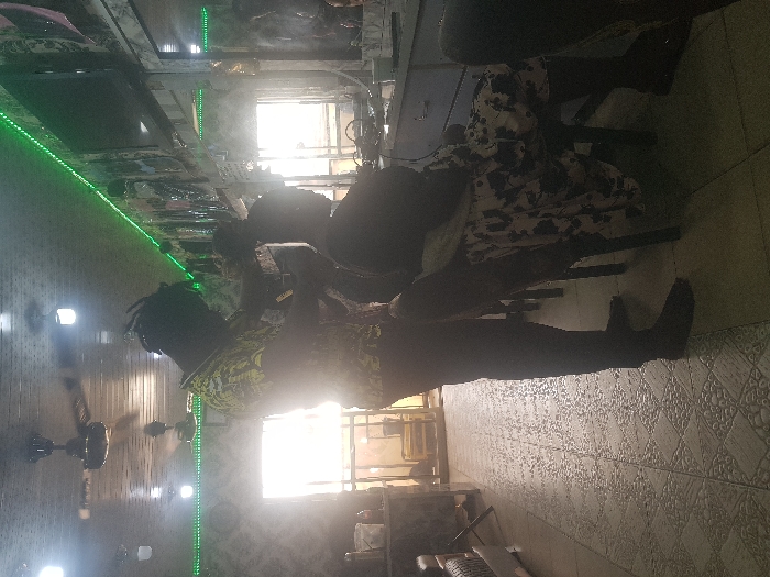 The scene takes place in a hair salon located in Atlanta, United States. Two individuals are present within the brightly lit interior. A standing individual, silhouetted, with dreadlocks and wearing a patterned short-sleeved top and dark trousers, is engaged in a hair service, actively working on the head of a seated individual. The seated individual, also largely silhouetted and viewed from the side, wears a light-colored, dark-patterned dress and occupies a dark chair. The environment features a patterned tiled floor. The ceiling contains multiple ceiling fans and recessed light fixtures. A prominent green LED strip light runs horizontally along the upper portion of the right wall, which also displays several mirrors and what appear to be hair products or extensions. Beneath these, a long counter or vanity is visible. On the left side of the frame, a table or counter holds various items. The background is dominated by bright, diffused light emanating from what appear to be large windows or an open doorway, indicating natural light ingress.