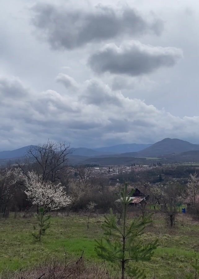 landscape under a cloudy sky. There are mountains in the background and a small town or village in the mid-ground. In the foreground is a grassy field with a few small pine trees and some flowering trees. A small building with a red roof is also visible in the mid-ground. The overall scene suggests a rural or countryside setting on a cloudy day.