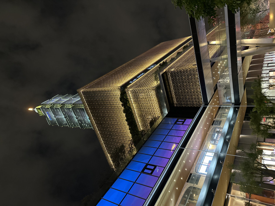 The image displays a nighttime urban scene in Taipei's Xinyi District, Taiwan