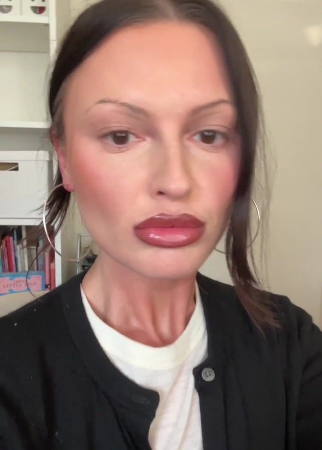 woman indoors, facing the camera. She is wearing a white t-shirt under a black cardigan, and large silver hoop earrings. She has dark hair and appears to be wearing heavy makeup, particularly noticeable on her cheeks and lips. She runs her hand through her hair and then brings the camera close to her face, focusing on her lips. Behind her, there is a white shelving unit with books and storage boxes.