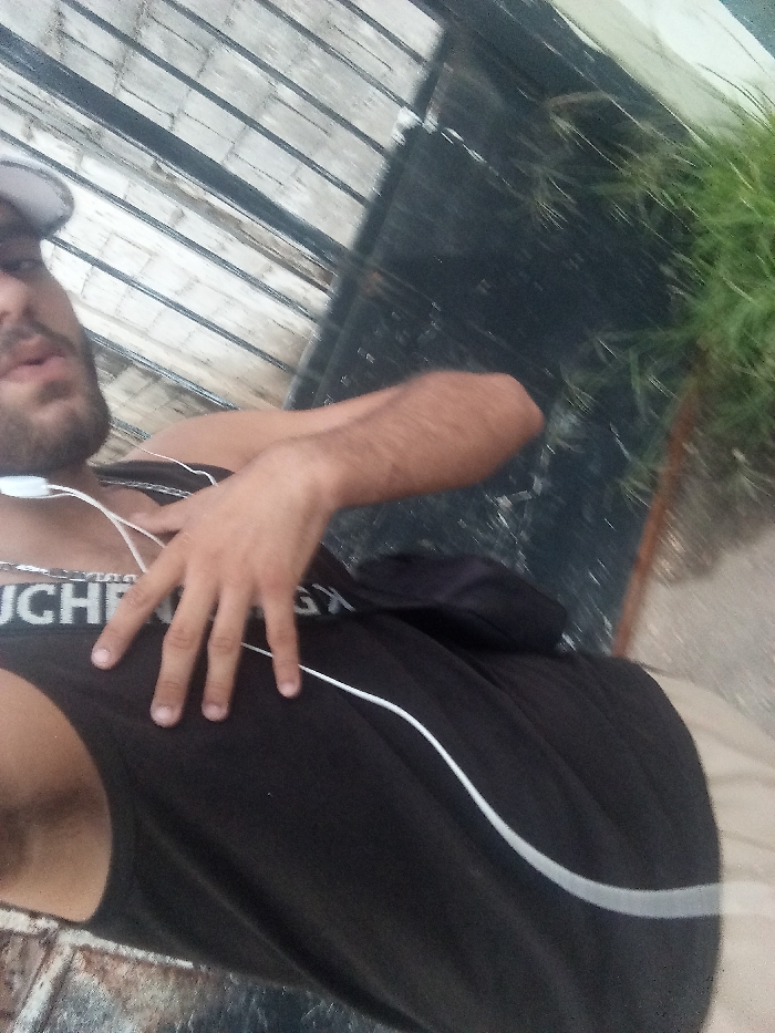 The image captures a male individual positioned diagonally in a close-up, selfie-style view. He wears a white baseball cap reversed, a black sleeveless shirt, and light-colored pants or shorts. A silver-colored chain is visible around his neck, and white wired earphones are draped across his chest. His right hand rests on his chest with fingers splayed. A black bag or fabric item is visible near his left side. The background, largely out of focus, shows an outdoor setting with a light-colored, textured surface exhibiting horizontal lines to the left, and a darker ground surface with green foliage to the right. The specific location within the city of Tinaquillo, Venezuela, cannot be identified from the visual evidence.