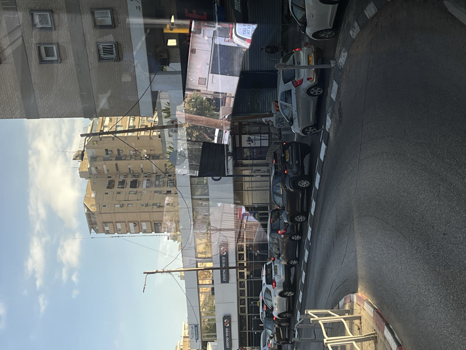 The image displays an urban street scene in Holon, Israel, observed from a low vantage point, likely through a window due to prominent reflections