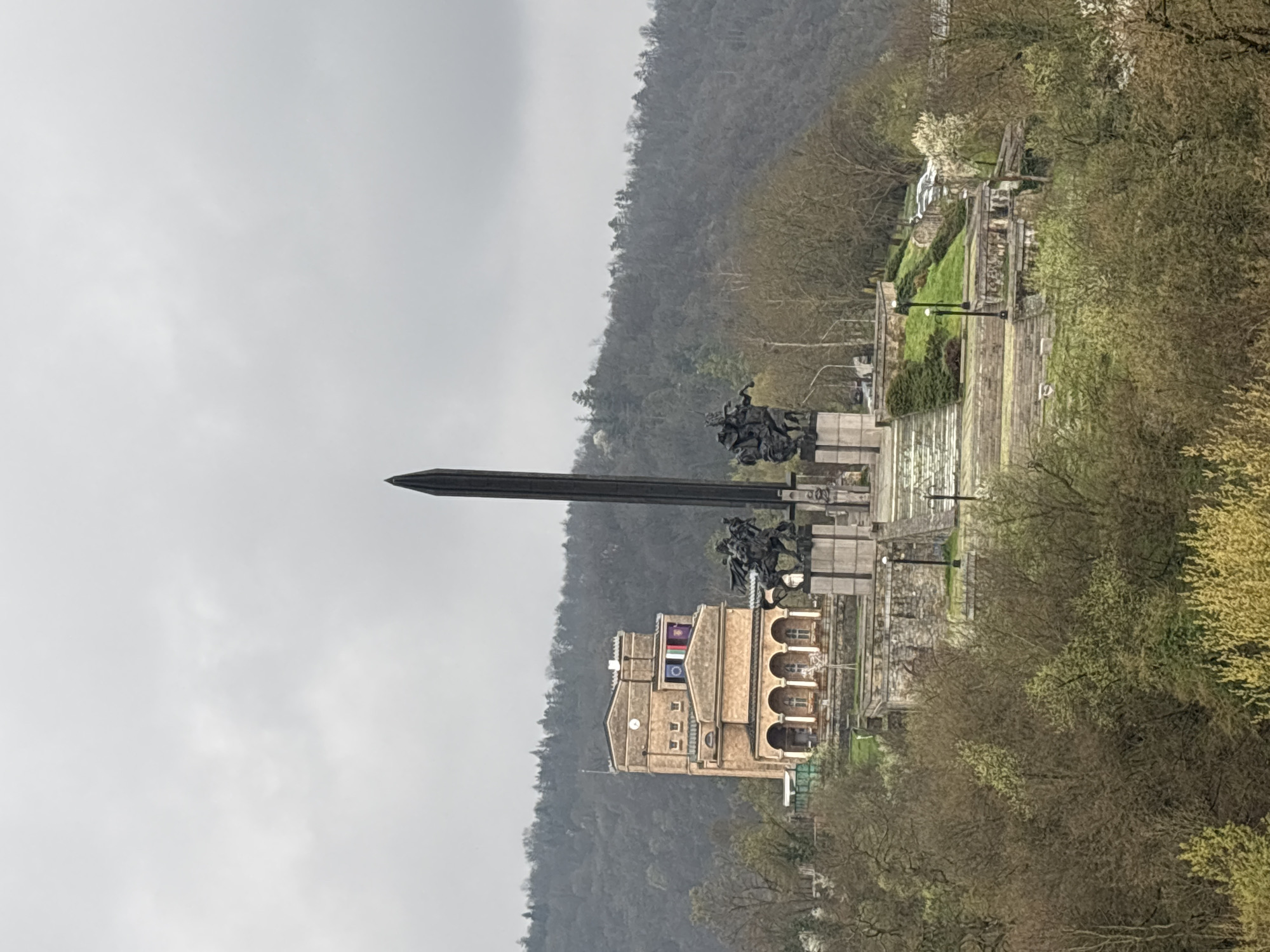 The image depicts the Monument of the Assens in Veliko Tarnovo, Bulgaria, viewed from a distance. In the foreground is a building with a beige facade, arched windows, and multiple flags displayed on the front. A tall, dark, spear-like obelisk rises from behind the building. Above the building and obelisk, there are two sculptures depicting groups of figures. A long stone pathway extends up a hill, bordered by green grass and trees on either side. A steep, densely wooded hill rises behind the monument complex. The sky is overcast and gray, suggesting a cloudy day. Trees with budding leaves are visible on the right.