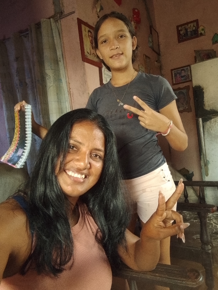 Two women pose indoors, smiling and making the peace sign. The woman in the foreground has long black hair and wears a peach-colored top. She sits in a dark wooden chair. Behind her, a younger woman in a grey t-shirt and light shorts also flashes a peace sign. Walls adorned with pictures create a cluttered, lived-in setting. A notebook is visible in the foreground.