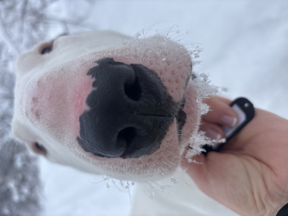 - "This close-up, low-angle image depicts the snout of a white Bull Terrier dog in an outdoor, snowy environment in Saint Petersburg, Russia" by FM-4zhu12, licensed under CC BY 4.0