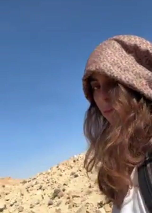 woman with long brown hair and a tan hooded head covering looking at the camera, turning to show a man with a backpack and two water bottles walking away from the camera on a dirt path in a desert-like environment with a blue sky. The path is lined with small rocks and sparse desert vegetation. The man is wearing a white t-shirt, black shorts, and a camo hat. The camera then pans down, focusing on the dirt path and the woman's feet walking on it.