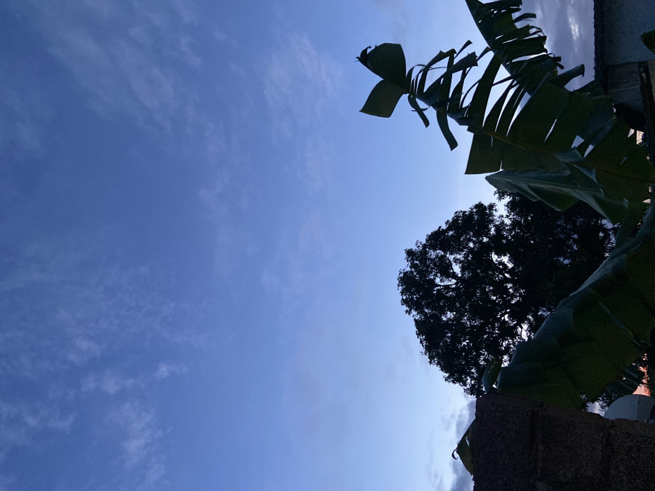 Against a blue sky dotted with faint clouds, the scene captures a view looking upwards. Silhouetted against the sky, a banana tree's leaves reach into the upper right corner. Below the banana tree, a dense tree with a full canopy fills the right side of the frame. A stone wall and additional foliage appear in the lower right corner, completing the natural composition.