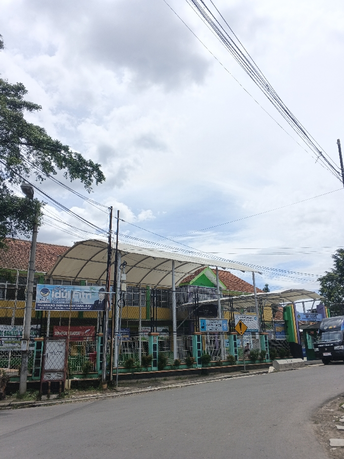 A two-story building with a red tile roof and a white awning above the second floor is seen from across the street. The building's facade is yellow and green with posters and signs attached to the fence. A black truck is parked on the right side of the street. Overhead power lines crisscross the sky. The sky is overcast with white clouds.