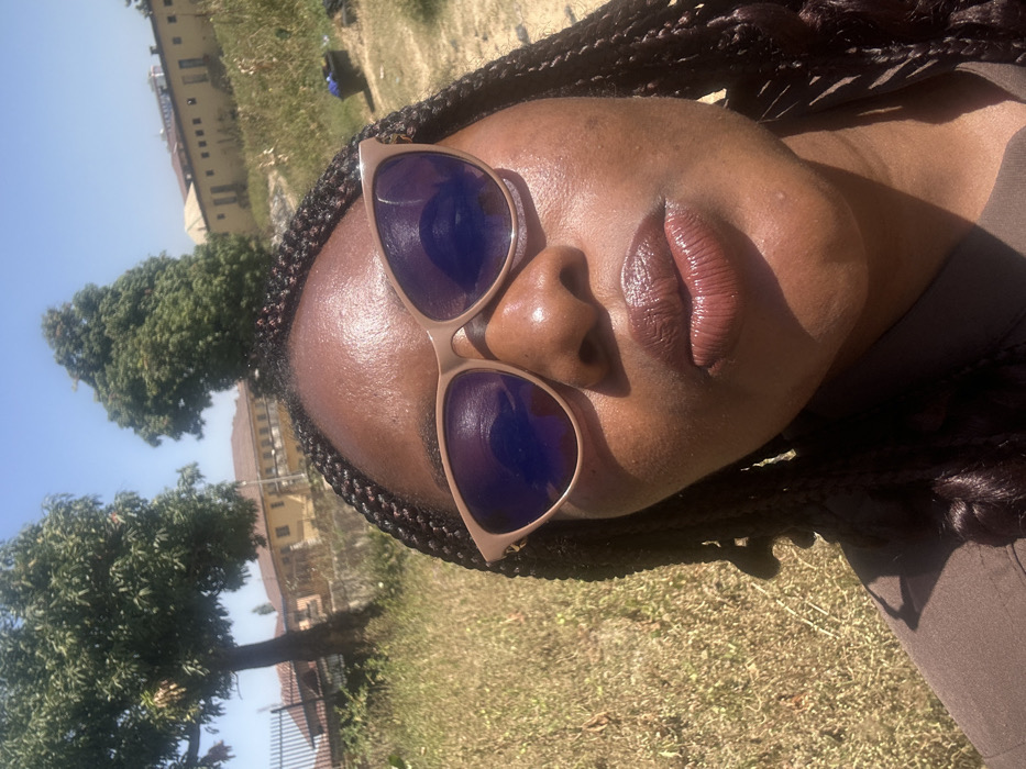 - "An extreme close-up selfie captured on a clear, sunny day in Jos, Nigeria, features a person with dark skin, dark braided hair, and glossy dark plum-colored lips, wearing light tan cat-eye sunglasses with reflective blue lenses" by FM-KeK3z2, licensed under CC BY 4.0