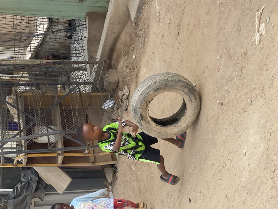 - "In an outdoor setting within Gbawe, Ghana, a young African boy, estimated to be between 4 and 6 years old, is depicted actively rolling a weathered, dirt-covered automobile tire" by FM-IRJUp1, licensed under CC BY 4.0