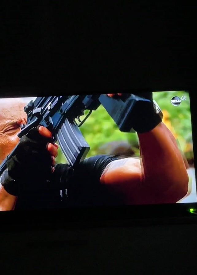 television displaying a scene with Dwayne "The Rock" Johnson. He is seen first looking up, then aiming a black assault rifle. The next shot shows him firing the weapon from inside a white vehicle. Finally, there's an explosion with smoke and debris near a building, with a figure jumping from the structure. The television is set on a white cabinet in a dark room. A "DIEMA" watermark is visible in the top right corner of the screen.