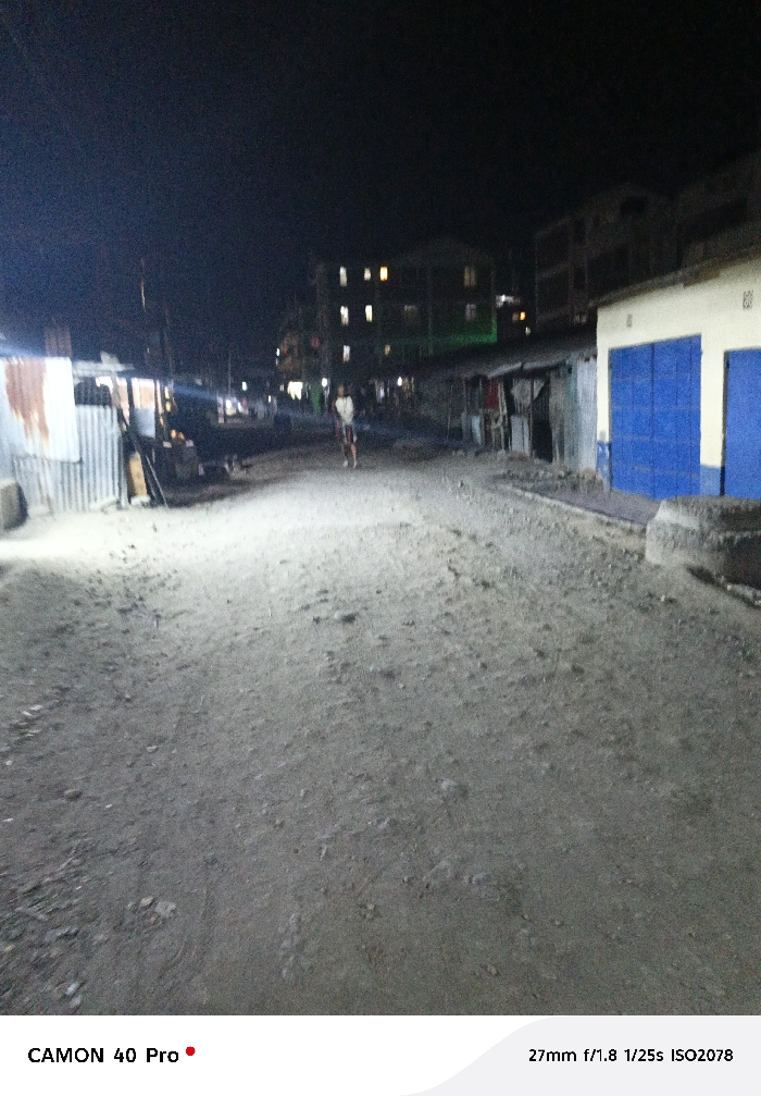 A night scene depicts a dirt road lined with modest buildings, some with corrugated metal and others with blue doors. A person walks in the distance, illuminated by sparse lighting. Taller buildings with lit windows rise in the background. The photograph was taken with a Camon 40 Pro at 27mm, f/1.8, 1/25s, and ISO2078.