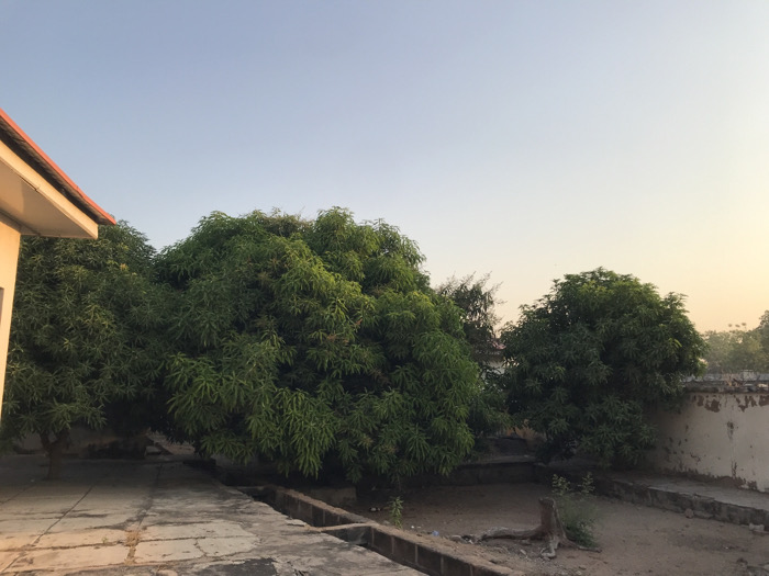 The scene depicts a tranquil outdoor setting, likely a backyard or courtyard. Two large, lush green mango trees dominate the frame, their foliage dense and vibrant. A building with a visible roof corner stands to the left, hinting at a residential structure. The ground is paved with concrete slabs, interspersed with a drainage ditch. A weathered wall stretches across the background, with bare dirt and a tree stump visible in the yard behind it. The sky is a pale blue, suggesting either early morning or late afternoon light.