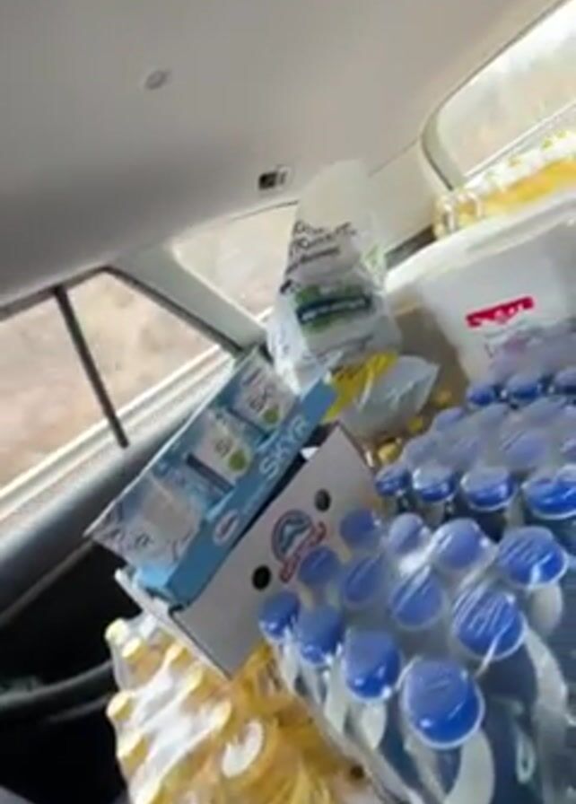 The camera is inside a car, turned around to face the back seat, which is filled with supplies. There are several packs of water bottles with blue caps, bottles of cooking oil with yellow liquid, a box of Skyr yogurt cups, and bags of food or supplies. The light outside is dim, suggesting an overcast day.