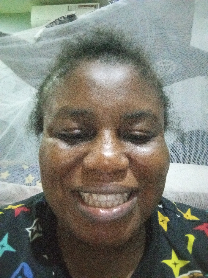 A close-up portrait shot, taken in the city of Agani, Nigeria, depicts an adult female with a dark complexion, centered in the frame. Her dark, textured hair is pulled back. She displays a broad, open-mouthed smile, revealing a full set of teeth, while her eyes are partially closed in the expression. Her skin appears somewhat reflective. She is wearing a dark-colored garment patterned with various multi-colored symbols, including stars in yellow, red, light blue, and white. In the immediate background, a white, translucent mosquito net is draped. Beyond the net, visible on the left, is a textile with a light-colored star pattern on a darker background, likely bedding. Higher in the background, a wall-mounted object, possibly an air conditioning unit, is partially visible against a light-colored wall. The setting indicates an indoor, likely residential, environment.