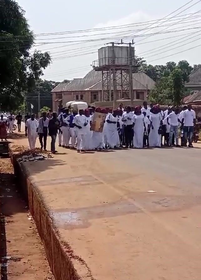 A medium shot captures a procession of people walking down a road. Most of the people are wearing white robes and red head coverings. Some men in the procession wear white shirts and jeans. Some men walk beside the procession wearing dark suits or white shirts. The group appears to be carrying something covered with white cloth. The road is unpaved, with a raised concrete edge on the left. In the background there is a large building with a water tower next to it. Power lines stretch above the road. Some trees and bushes are on the side of the road.