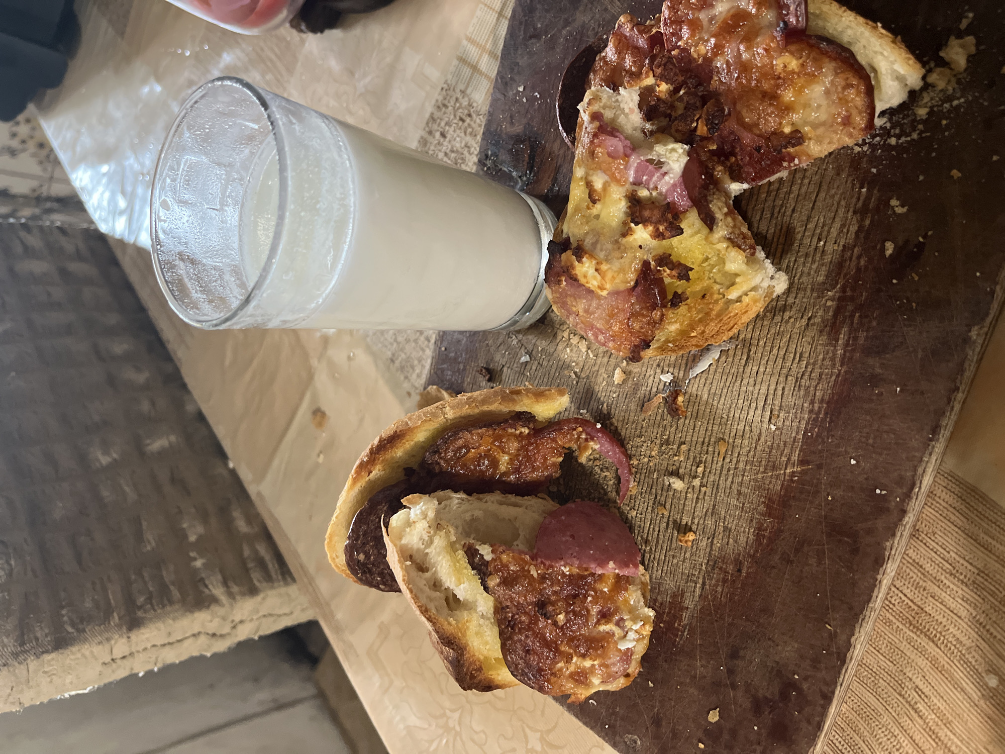 The image displays an indoor scene in Lozarevo, Bulgaria, featuring a meal served on a well-worn, dark brown wooden cutting board positioned on a patterned beige and light brown tablecloth. The primary subjects are two irregularly shaped pieces of a bread-based dish, each appearing partially consumed or broken. The piece on the left shows a golden-brown baked crust, with visible internal elements including pinkish processed meat slices, white crumbly cheese, and darker, possibly charred, food fragments. A dark, elongated food remnant and a curved reddish food item are also discernible within this piece. The piece on the right exhibits similar characteristics, with a golden-brown, melted cheese and meat topping, revealing pinkish meat and white cheese within its structure. Scattered food crumbs and debris are present on the cutting board. To the right of the food, a clear glass filled with a milky-white liquid, consistent with a dairy beverage, stands on the cutting board, exhibiting condensation on its exterior. The background on the left consists of a blurred, light-colored, textured surface, possibly a wall or furniture. On the right, a red object and other indistinct items are partially visible. No individuals are present in the scene.