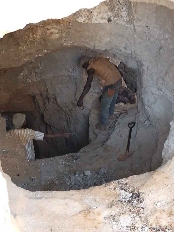 Two men stand inside a cave-like structure. One man, wearing a striped shirt and a cap, points into a dark opening. The other man, in a brown shirt and blue jeans, reaches downward. A shovel leans against the wall. The walls of the structure appear to be made of light-colored rock or soil. Loose dirt and debris cover the ground.