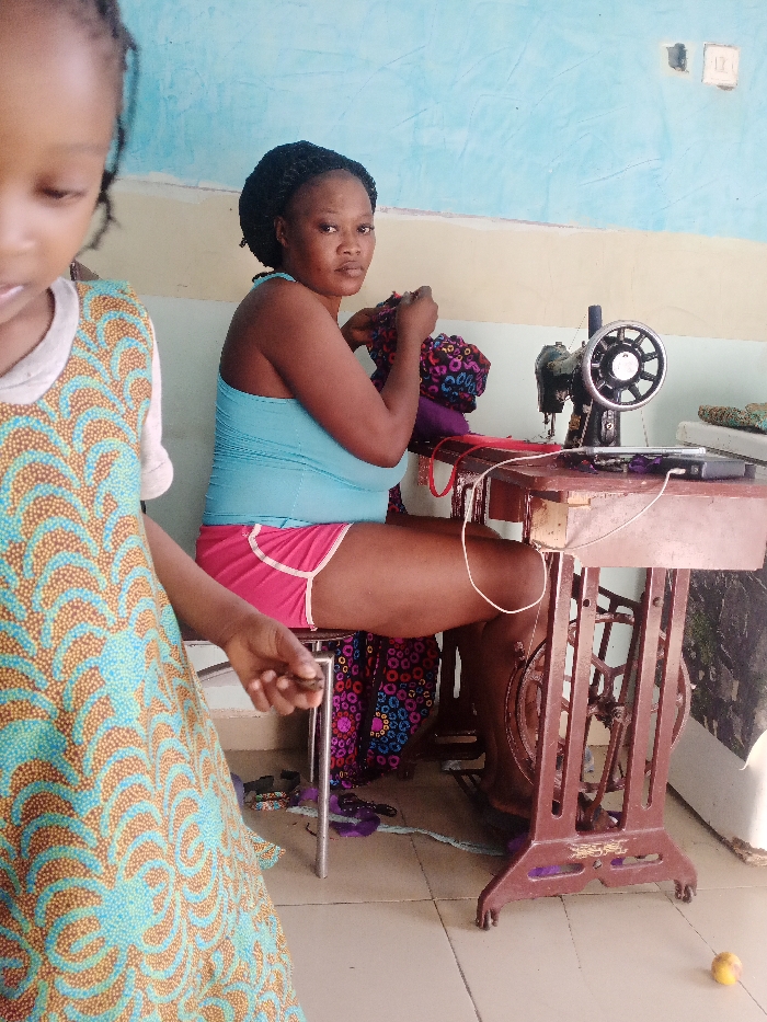 The image captures an indoor scene in the city of Unknown, Unknown, featuring an adult female and a young child. An adult female, with dark skin and dark braided hair, is seated in the mid-ground, looking directly at the camera with a neutral expression. She wears a light blue sleeveless top and pink athletic shorts with white trim. Her hands are actively engaged with a piece of brightly patterned fabric, featuring multicolored circles on a black background. To her right, a vintage-style, dark-colored treadle sewing machine with a prominent spoked handwheel is mounted on a dark brown wooden table with an ornate cast-iron base. A dark rectangular object, possibly a mobile phone, rests on the table with a white cable extending from it. Additional fabric, including purple pieces, is visible on the table and draped beneath. In the left foreground, a young child, likely female, is partially visible. She wears a sleeveless dress with a teal and orange-brown patterned design. Her right hand is visible, holding a small dark object, while her face is mostly out of frame and oriented downwards. The environment consists of a light-colored tiled floor. The background wall is painted in two horizontal sections: an upper section of textured light blue and a lower section of plain light beige. Two electrical outlets, one appearing uncovered, are visible on the upper right wall. A small orange-yellow fruit lies on the floor in the lower right corner, and scattered fabric scraps are visible near the sewing machine.