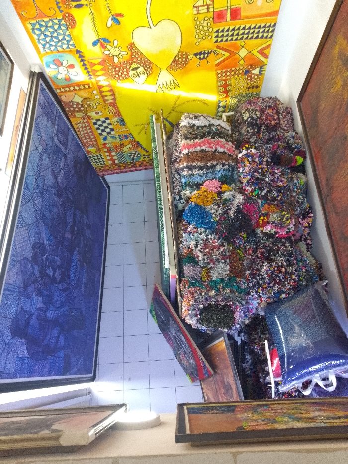 This image captures an interior scene, likely an art studio or gallery storage area, located in Ikate, Nigeria