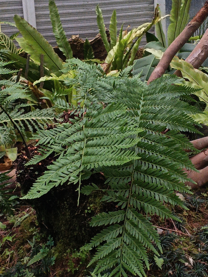 Lush green ferns dominate the frame, their delicate fronds exhibiting fine, intricate patterns. These plants grow from a mossy base, surrounded by other greenery. A weathered, brown branch intrudes on the right, adding texture to the scene. In the background, broader, lance-shaped leaves peek out, interspersed with a gray, corrugated surface. This botanical composition creates a vibrant and layered display.