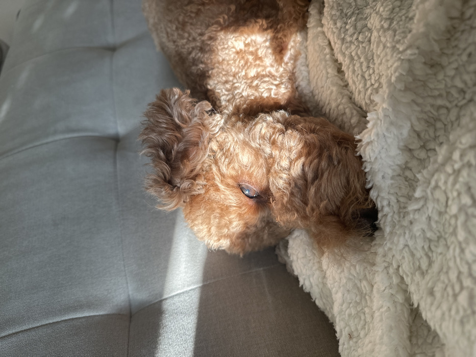 A reddish-brown, curly-haired dog, resembling a poodle or similar breed, is depicted resting indoors in Rishon LeZion, Israel. The dog lies on its side, partially covered by an off-white, fluffy, textured blanket, against a light grey, tufted upholstered couch. Its left eye is partially open, revealing a light-colored iris. A distinct diagonal beam of direct sunlight illuminates the dog's back and head, and a section of the couch, with the remainder of the scene in shadow.