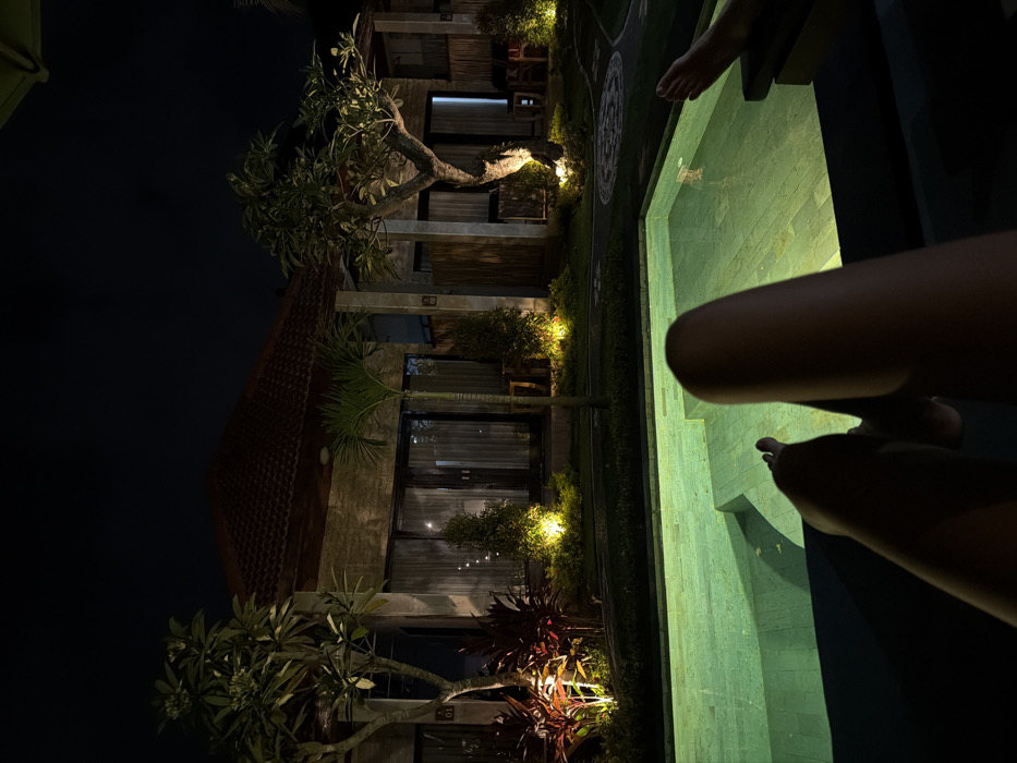 The image presents a nighttime scene in Pecatu, Indonesia, captured from a low vantage point. In the immediate foreground, the silhouetted legs of two individuals are visible, indicating they are reclining, likely on lounge chairs. Directly ahead, a rectangular swimming pool with steps is prominently featured, its water illuminated with an aquamarine green hue, reflecting ambient lights. Beyond the pool, a meticulously landscaped garden area contains manicured grass, various shrubs, a frangipani tree with light foliage, and a slender palm tree. Ground-level spotlights illuminate specific sections of the foliage, creating bright pools of light and deep shadows. A paved pathway with a decorative circular inlay is visible on the right side of the garden. In the background, a row of single-story villa-style buildings with traditional reddish-brown tiled roofs and light-colored, textured facades are present. Each building features large glass sliding doors and exterior lighting fixtures above the entrances. Building identifiers, such as "01," are discernable on the structural columns of the units. The sky overhead is dark, consistent with a clear night.