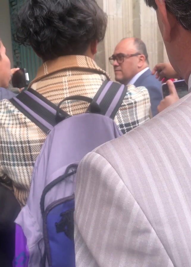 medium shot of a man wearing glasses and a suit, surrounded by people. He is speaking to someone to his left, who is wearing a brown plaid jacket and a purple backpack. Another person in a striped suit stands to the right, partially obscuring the view. Several hands holding phones are visible, suggesting the man is being photographed or recorded. The setting appears to be outdoors, possibly in front of a stone building.