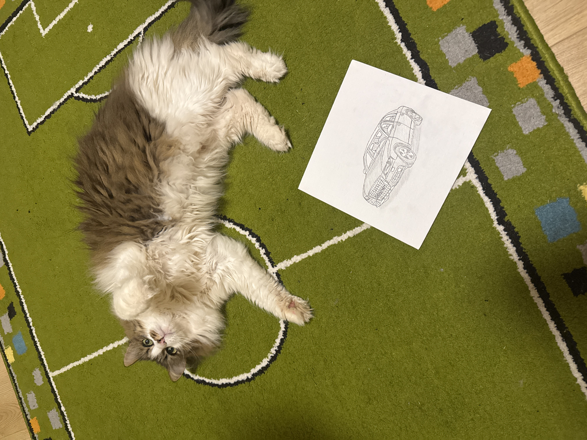 A top-down view shows a long-haired cat lying on its back on a green rug designed to resemble a soccer field. The cat is primarily white with brown patches, has green eyes, and is looking directly at the camera. To the right of the cat is a white sheet of paper with a detailed pencil drawing of a car on it. The rug features white lines marking the boundaries of the soccer field, including a center circle. The rug also has a border of patterned squares in various colors. The setting appears to be indoors, possibly a residence. There is no indication of Sliven, Bulgaria.