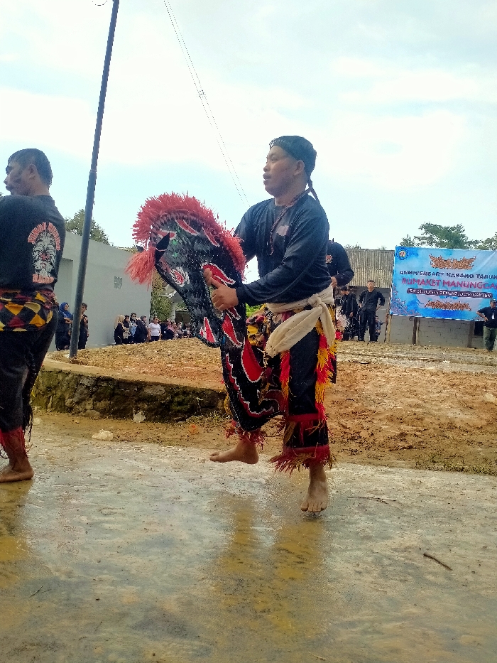 An outdoor scene in Ganten, Jembrana, Indonesia, depicts a traditional Kuda Lumping dance performance under an overcast sky