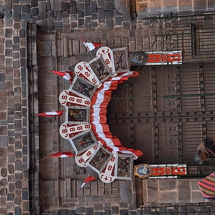 The image depicts the elaborately decorated facade of a large colonial-era stone church or cathedral, likely the Cathedral Basilica of the Assumption of the Virgin in the Plaza de Armas, Cuzco, Peru. The building is constructed from dark grey and brown cut-stone blocks. Above a large, ornate dark brown wooden door, protected by a tall wrought-iron gate, a semicircular array of nine framed religious paintings is displayed within the stone archway. Each frame is white with red decorative patterns, and the paintings depict various religious figures and scenes. Beneath this array, a red and white pleated fabric valance is draped in an arch shape, mirroring the doorway. Multiple small Peruvian flags, red and white, are affixed to the facade, interspersed among the paintings and along the upper structure. On the stone pilasters flanking the entrance, two vertical banners are visible, each featuring an oval or rectangular framed image (likely a saint or the Virgin Mary) atop a red and white patterned fabric strip. A carved stone relief of a lyre or harp is present on the left side of the facade. In the lower portion of the image, near the wrought-iron gate, two individuals are partially visible: one person from the back wearing a multi-colored striped poncho on the far left, and an older male with grey hair wearing a brown jacket, facing away from the viewer, positioned centrally.